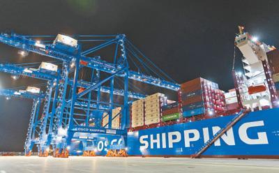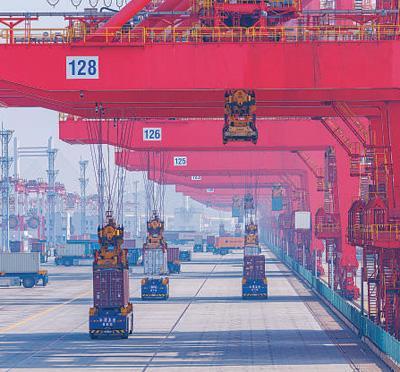 共建“一带一路”国家在工作制度对接、技术标准协调、检验结果互认等方面强化合作、统一标准,贸易自由化便利化水平不断提升。上海洋山港海关对接共建国家进出口货物相关标准,推动通关一体化方式申报,提升通关效率。图为无人驾驶的全自动导引车在洋山港穿梭往来,搬运集装箱。