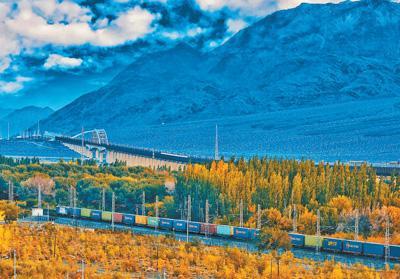2013年,随着共建“一带一路”倡议提出,中欧班列应运而生。今年11月20日,第十万列中欧班列正式出境。截至目前,中欧班列累计运送货物超1100万标箱、货值超4200亿美元,货物品类达53大类5万余种。图为中欧班列行驶在新疆乌鲁木齐达坂城湿地。