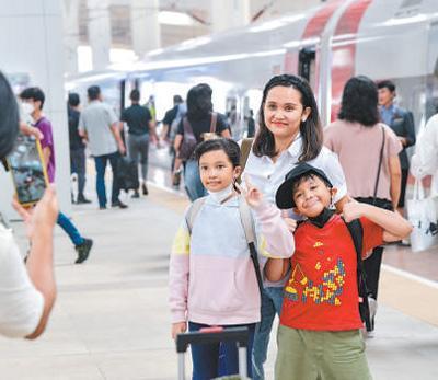 雅万高铁是我国在境外完成全过程勘察设计建设的首个高铁项目,于去年10月17日正式开通运营,是中印尼共建“一带一路”合作的典范。图为乘客在和雅万高铁动车组合影留念。