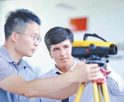 在塔吉克斯坦首都杜尚别的鲁班工坊,来自天津城市建设管理职业技术学院的老师(左)为当地学生提供指导。