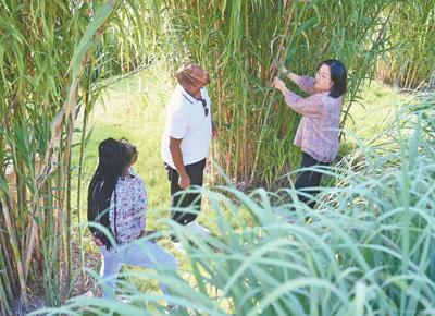 福建农林大学国际菌草工程技术研究中心工作人员(右)在向卢旺达留学生介绍菌草品种“绿洲1号”芦竹的生长情况。