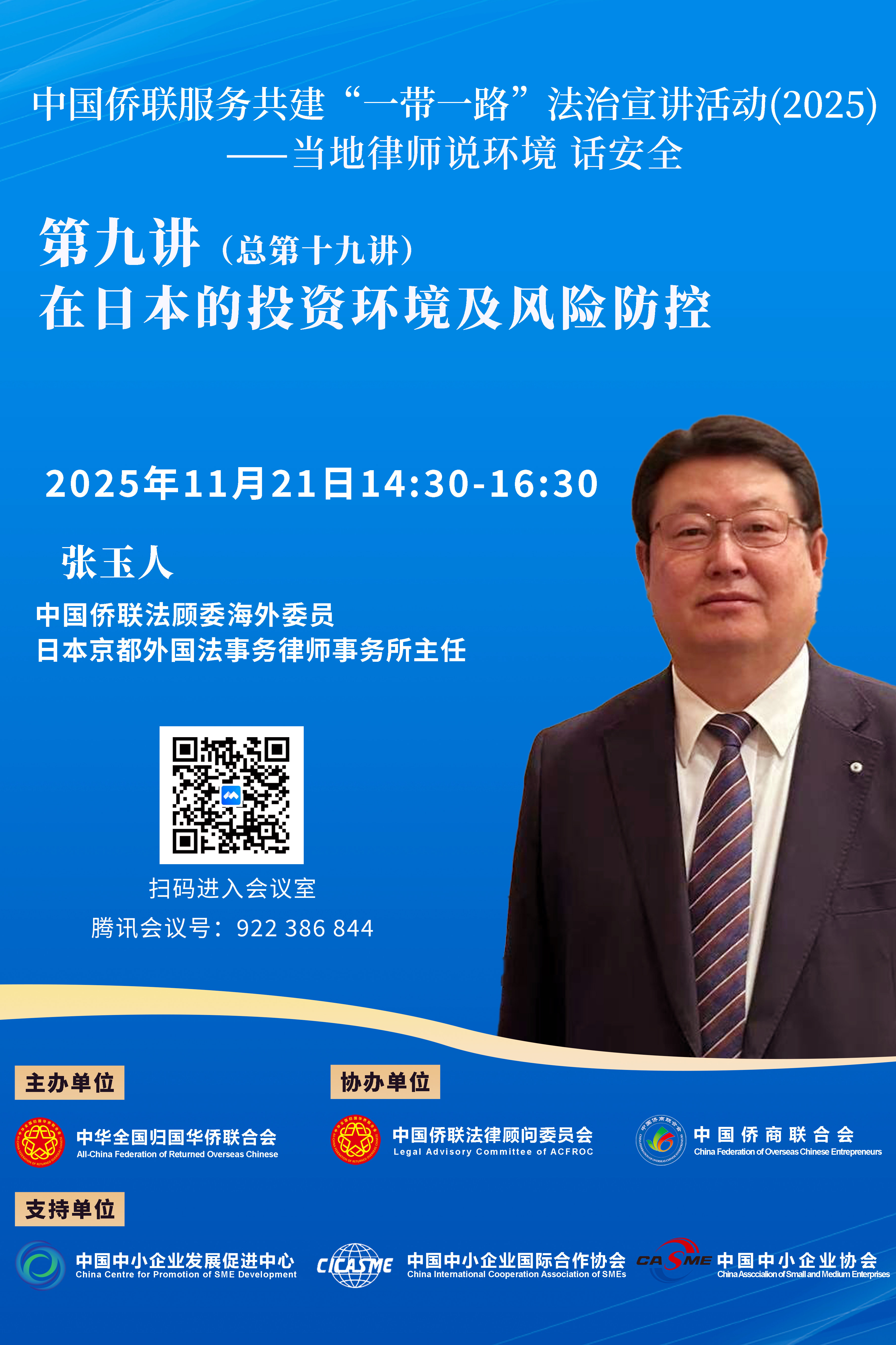 今年第九讲(总第十九讲)将于2025年11月21日(周五)14:30开播,由中国侨联法顾委海外委员日本张玉人律师主讲。张律师毕业于日本国神奈川大学,获得法学硕士学位,曾在日本L&J律师事务所执业多年,于2010年10月成立了京都外国法事务律师事务所,并担任律师事务所主任。张律师具有中国律师资格和日本外国法事务律师资格,具有深厚的中日法律知识功底和执业经验,从事涉外法律工作24年以来,处理了知识产权、劳动纠纷、工伤事故、交通事故、医疗事故、国际婚姻纠纷等法律问题。张律师还担任最高人民法院中华司法研究会理事、全日本华人促进中国和平统一协会执行会长、在日中国律师联合会创始副会长等职务,并于2021年8月起,在网上免费开办法律讲座,向在日华侨华人宣传中日法律知识,深受好评。