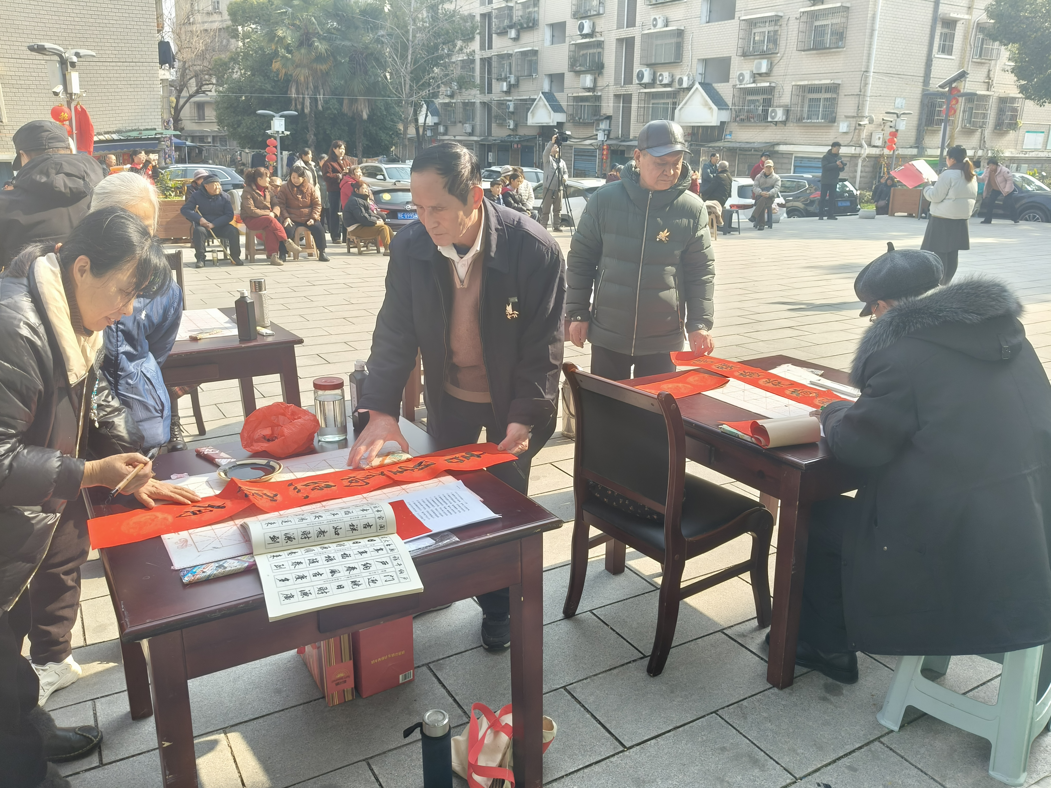 好戏连台不停歇,墨香福气送不停。演出间隙,现场的另一处“打卡点”同样人气爆棚——丫口社区老年学校书法老师们摆好笔墨纸砚,凝神挥毫送福,为现场居民免费书写春联、送“福”字,用温润的笔墨传递祝福。