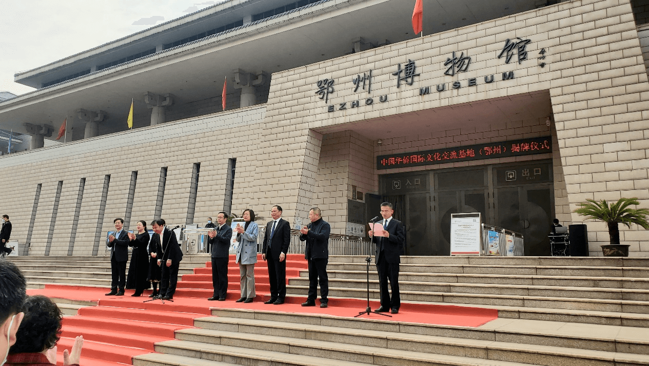 (鄂州市侨联熊鹰)11月17日,湖北省侨联党组书记、主席吴朝安和鄂州市委常委、统战部长邹霞为中国华侨国际文化交流基地——鄂州博物馆揭牌,参与仪式的还有省侨联党组成员、副主席侯继文,副主席、伟鹏集团董事长喻鹏。