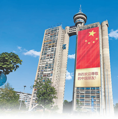 塞尔维亚首都贝尔格莱德市内的建筑上悬挂起巨幅五星红旗和中文标语,欢迎习近平主席到访。本报记者 谢亚宏摄