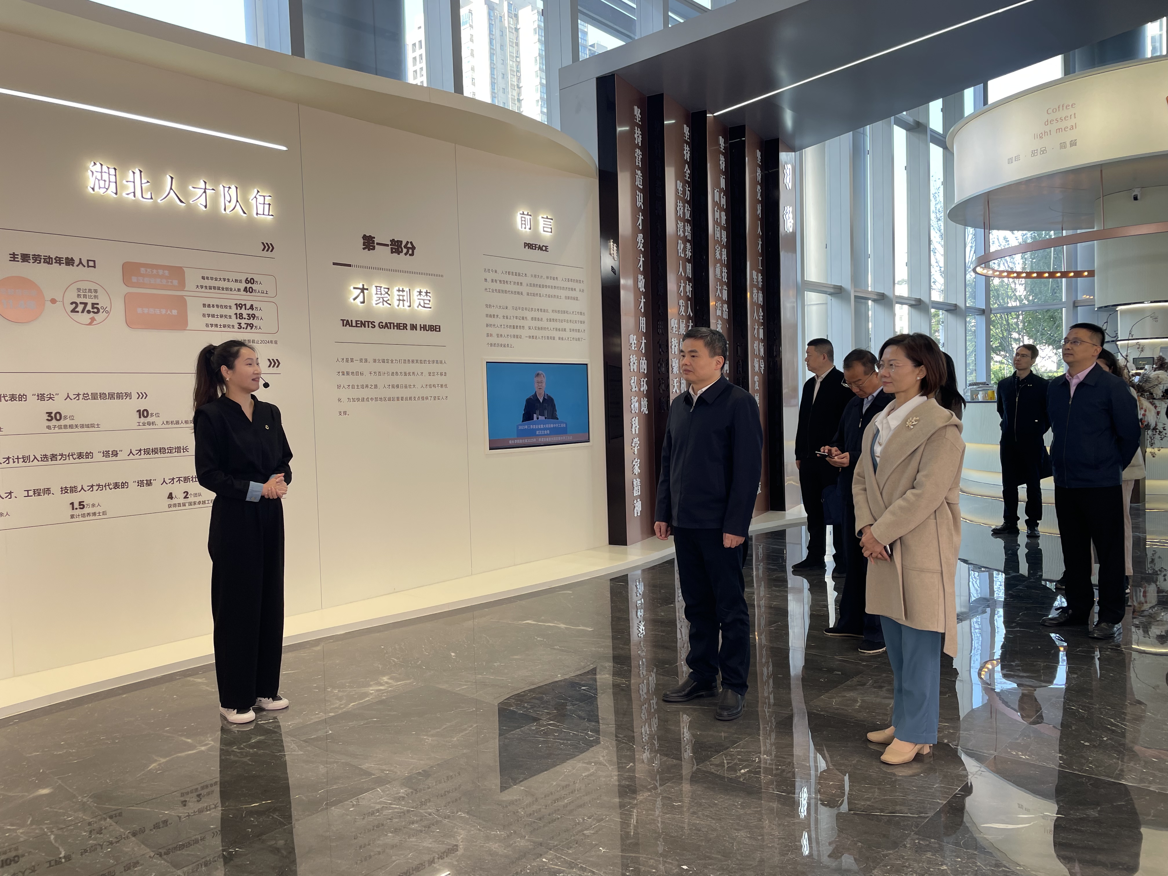 冯伟一行参观了长江人才大厦湖北人才展厅和长江国际人才会客厅,详细了解省人才集团历史沿革、功能定位、产业布局和人才引进工作情况。