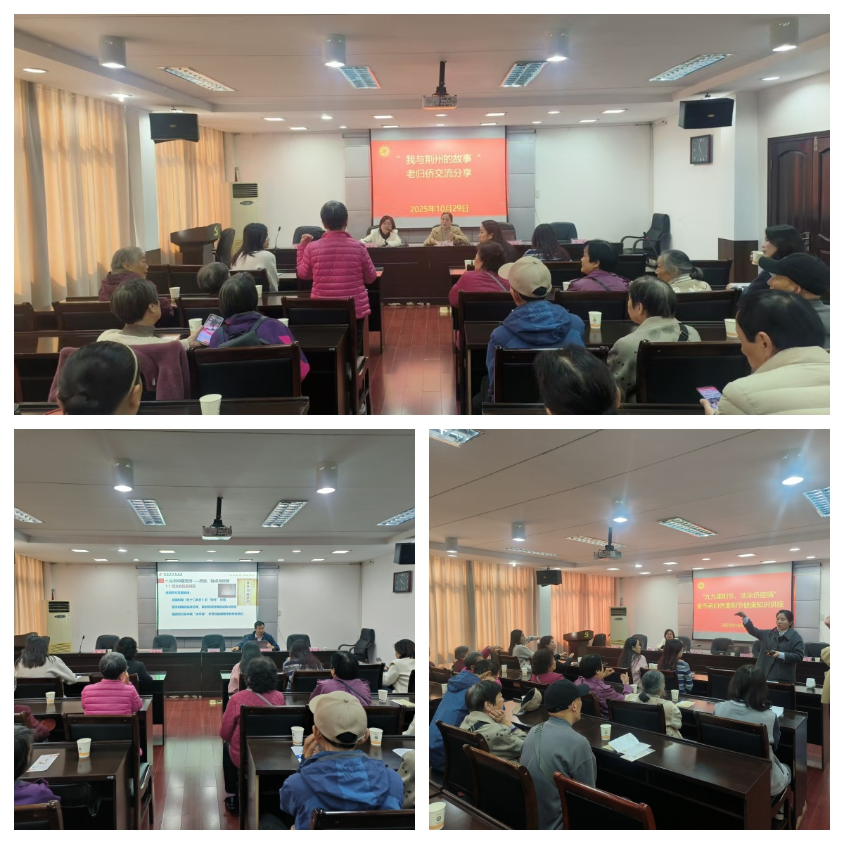 活动中,组织学习了党的二十届四中全会精神和新华社相关社评,开展了“我与荆州的故事”交流分享会,邀请荆州市中医院内分泌科主任、副主任医师王永贞讲解了老年健康养生等中医知识。大家畅谈学习体悟、分享海外见闻、体验中医推拿,活动现场洋溢着浓浓的敬老情、侨胞谊。