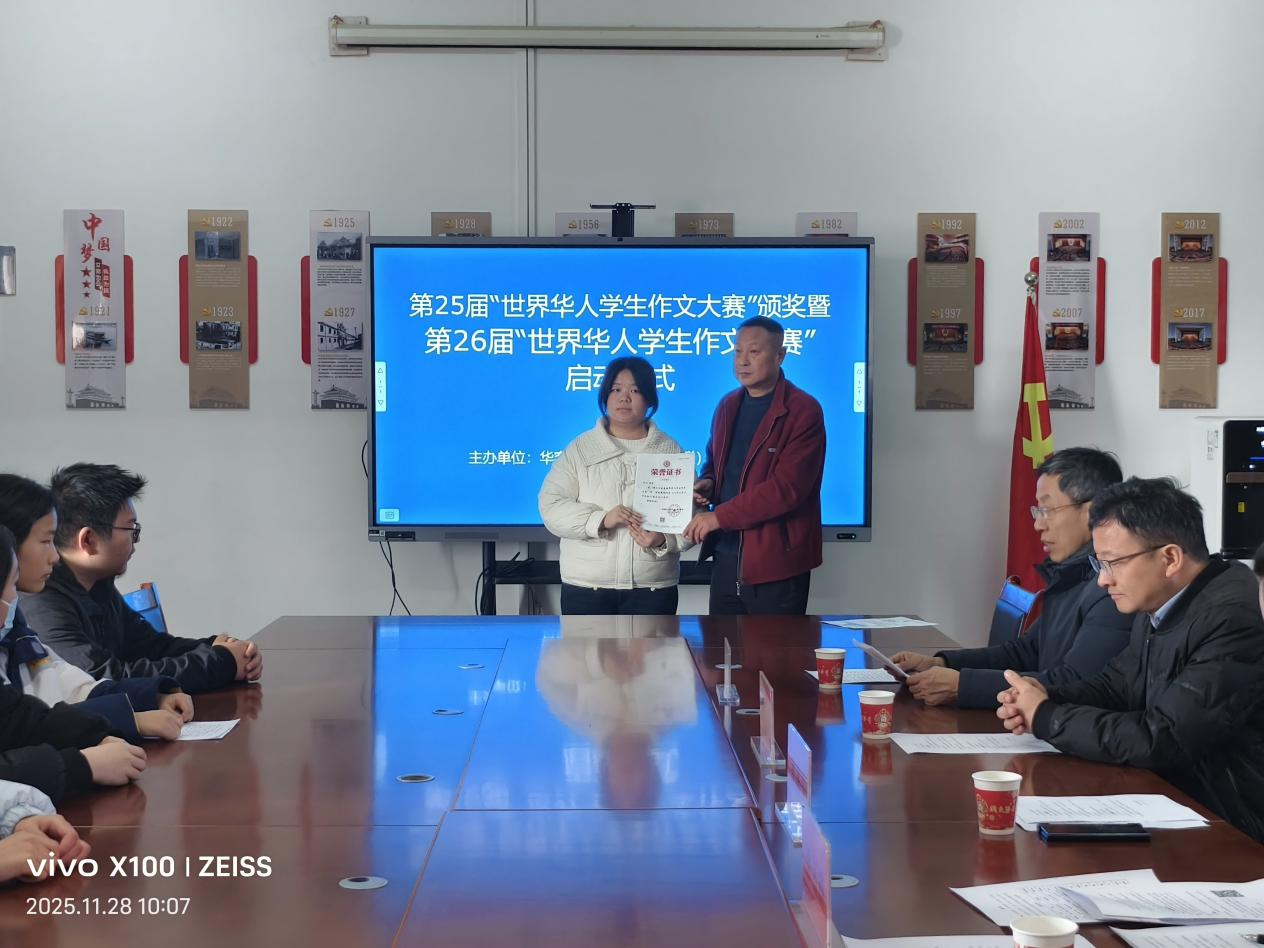 (涂嘉楠)11月28日上午,鄂州市华容区侨联联合区教育局举办第25届“世界华人学生作文大赛”颁奖暨第26届大赛启动仪式。活动现场为辖区内获奖学生、优秀指导老师颁发荣誉证书,并动员全区师生积极备战下一届赛事,旨在进一步发挥全球华人学生文化交流的桥梁纽带作用,坚定文化自觉自信,传承中华文化基因。