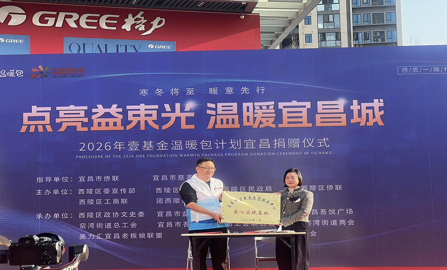 (付琳琳)1月11日下午,由宜昌市侨联、市慈善总会指导,西陵区窑湾街道办事处、宜昌吾悦广场、宜昌市益束光志愿服务中心联合承办的“点亮益束光 温暖宜昌城”2026年壹基金温暖包计划宜昌捐赠仪式在宜昌市西陵区吾悦广场举行。活动为123名困难学生送上御寒及学习物资,以公益善举续写宜昌“志愿之城”文明华章。