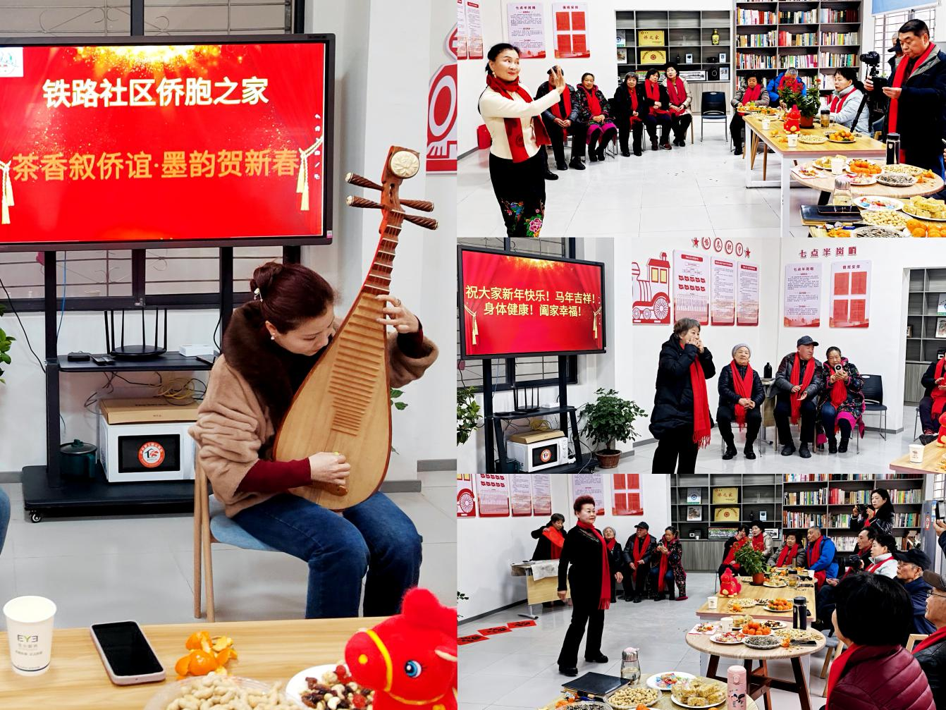 茶过三巡,才艺登场。琵琶独奏《金蛇狂舞》率先弹响,指尖翻飞,弦音似爆竹般点燃全场;紧接着,口琴联奏《我的祖国》《我的中国心》《友谊地久天长》接力上演,侨眷李阿姨用琴声串起家国情怀与异域情谊,大家自发打起节拍,现场秒变“小型音乐厅”。侨眷黄阿姨自编自演的舞蹈随后登场,一招一式把火热年味与襄阳楚风汉韵同时卷进窗外凛冽的冬日。在铁路社区“侨胞之家”没有专业演员,只有“民星”当家,掌声一浪高过一浪,茶香与音符在空气里交织成最暖的年味。