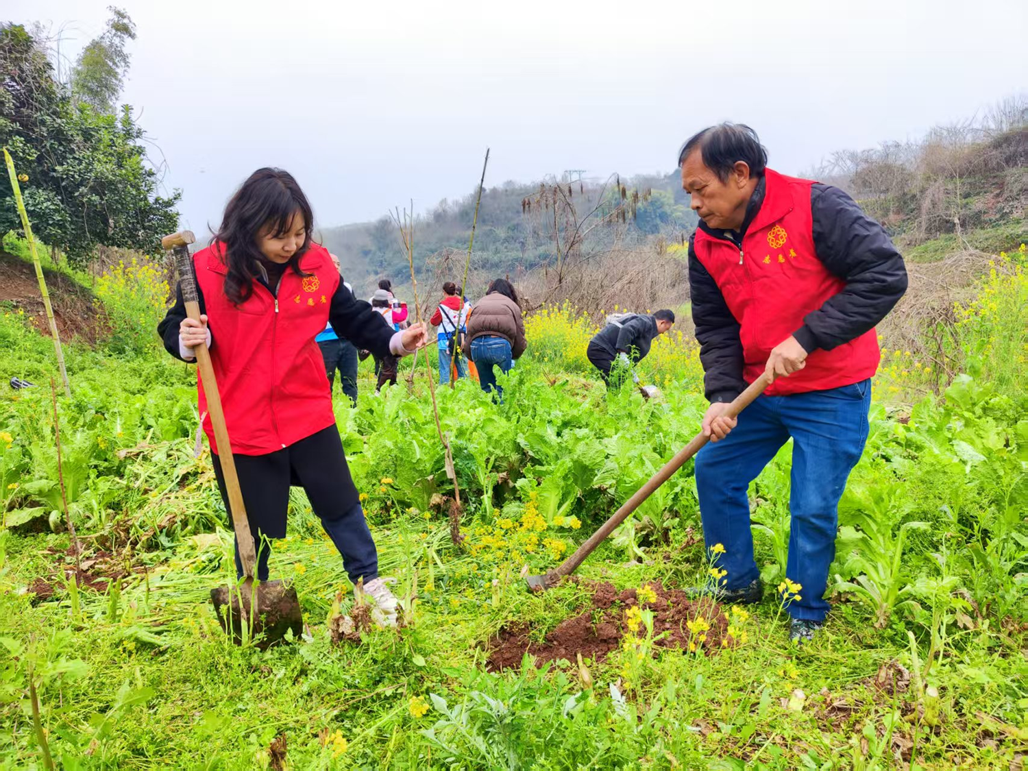 植树现场,志愿者们身着红马甲,热情高涨、干劲十足。大家三五成组,挥锹铲土、扶苗填坑,每个环节都一丝不苟,田间地头一派热火朝天的劳动景象。经过两个多小时的辛勤劳作,百余棵桃树、李树迎风挺立,原本空旷的土地披上新绿,为春日乡村增添了勃勃生机。