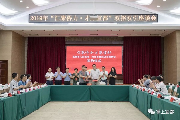 2019年6月21日,“汇聚侨力•才聚宜都”双招双引座谈会在宜都市成功举办,湖北新侨高层次人才与宜都市党政部门领导、企业家汇聚一堂,共商宜都发展大计,共谋合作愿景。省侨联副主席、国家特聘专家、省新侨会会长陈义红,宜昌市侨联主席陈红,宜都市委书记罗联峰,市委副书记、市长谭建国出席座谈会。市委常委、组织部部长、统战部部长邹青松主持会议。副市长欧阳澍在会上推介宜都市招才招商环境,市领导胡卫东、黄兴发参加座谈会。