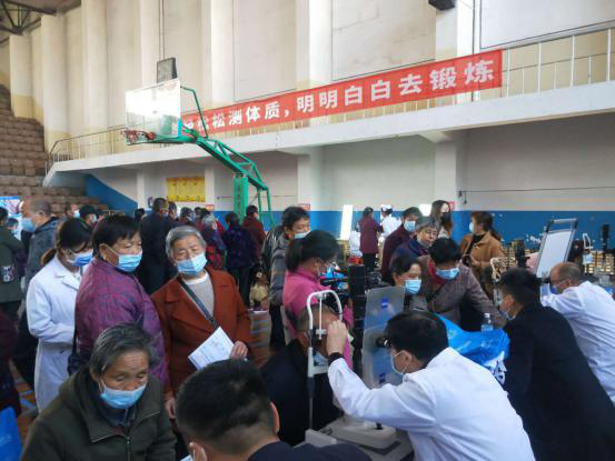 活动现场爱尔眼科9位医护人员在为现场群众检查眼疾