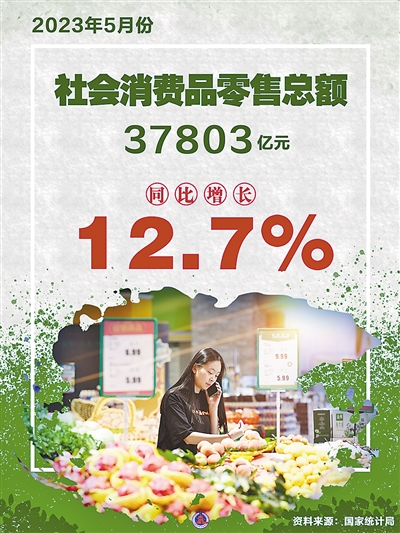 市场销售平稳增长。随着消费场景拓展、居民外出购物增加,市场销售继续扩大,服务性消费较快增长。5月,社会消费品零售总额同比增长12.7%,其中餐饮收入增长35.1%。