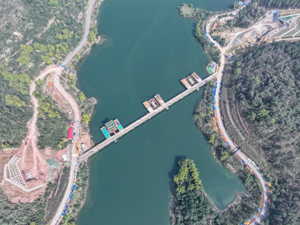 这是2月19日拍摄的位于重庆市铜梁区的成渝中线高铁玄天湖大桥建设现场(无人机照片)。新华社记者唐奕摄