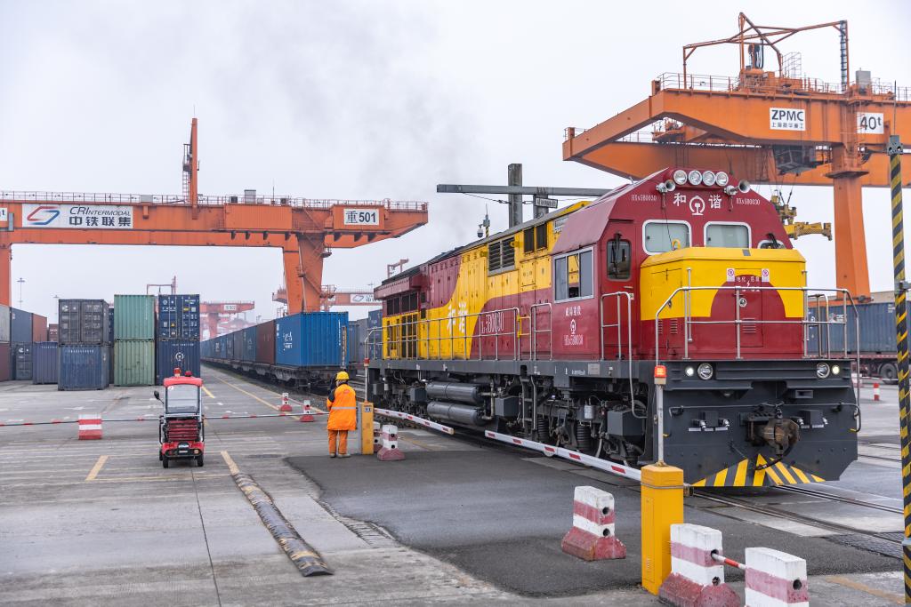 3月7日,一列满载机械设备、整车及零部件等货物的中欧班列在重庆团结村中心站等候发车。新华社记者黄伟摄