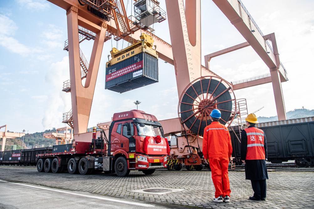 1月4日,在重庆万州新田港站,工作人员进行集装箱吊装作业,将专列货物转运至公路物流环节。新华社记者唐奕摄