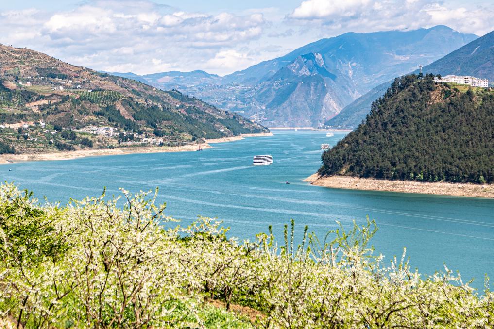3月25日拍摄的重庆市巫山县曲尺乡长江两岸的万亩李花。新华社记者唐奕摄